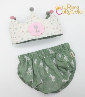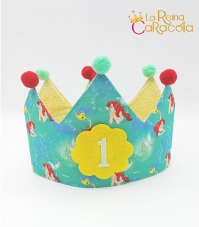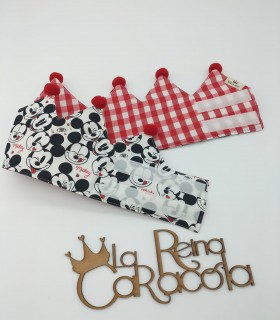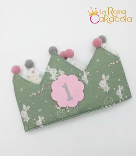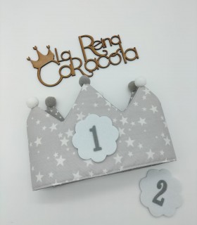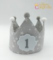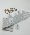 Corona cumpleaños con animalitos indios. La corona es reversible, por el lado de dentro es color gris con triángulos blancos.