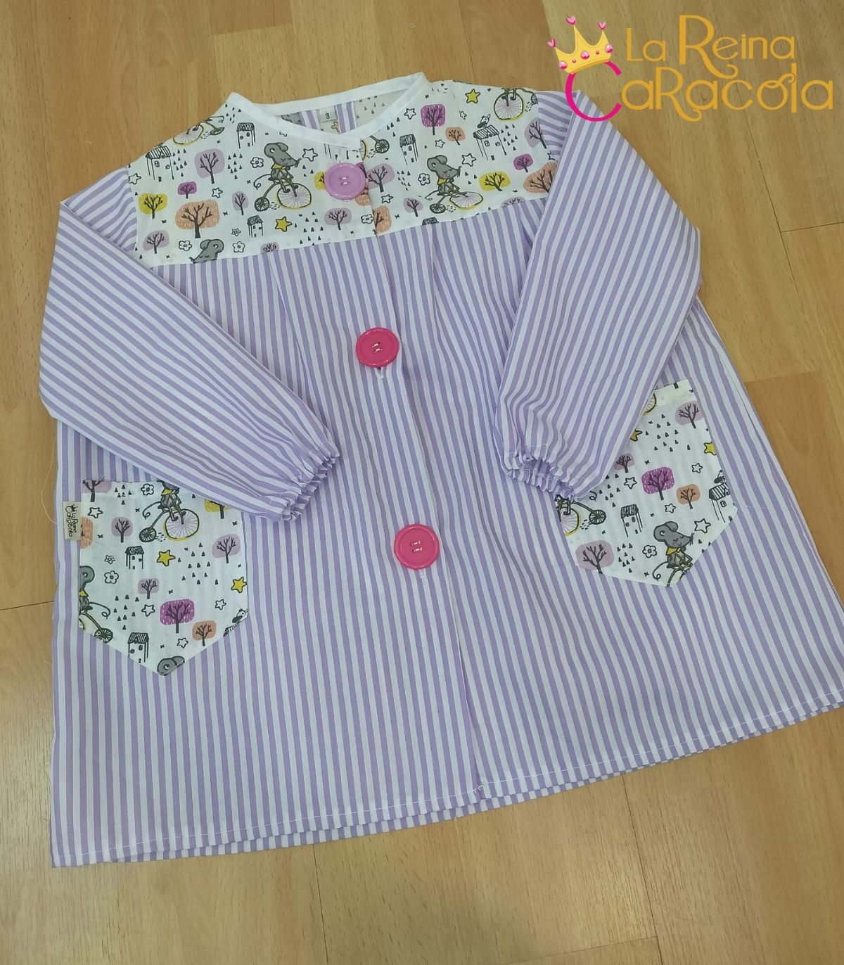 Bata escolar de rayas lilas combinada con estampado de ratitas.